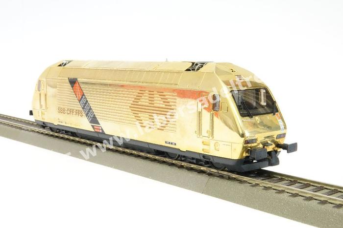 Jubi-trio Set con Re 4/4 SBB in livrea commemorativa '50 anni Hag', una Re 460 livrea oro '150 Ferrovie in Svizzera' e una Re 465 in livrea marrone '125 anni SLM' - con libro commemorativo sulla Re 460