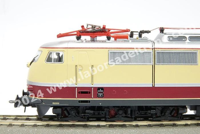 Locomotiva elettrica DB Br 103 002, pantografi a rombo, livrea TEE rosso/crema con mondanature e tetto argento, logo biscotto, epoca IV