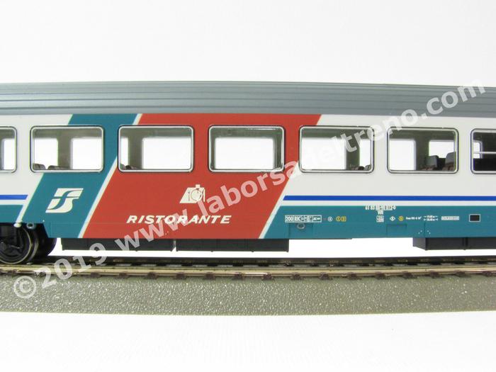 Set 4 carrozze FS tipo Gran Confort, una ristorante tetto cannellato per servizi internazionali e 3 di 1° cl. A scompartimenti, livrea XMPR, logo Trenitalia, epoca V