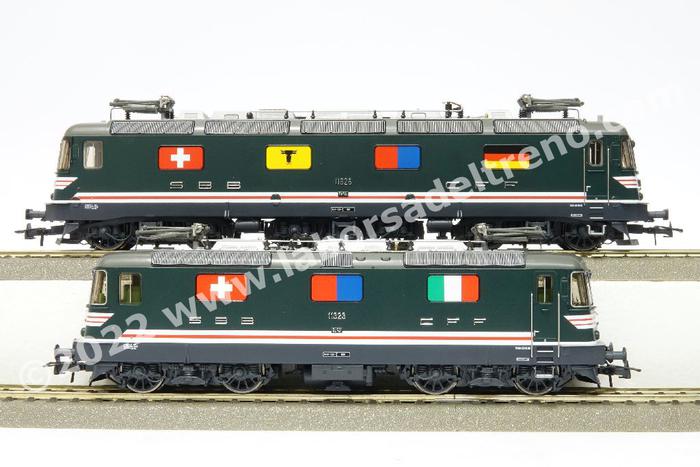 Coppia locomotive elettriche SBB Re 4/4 11323 + Re 6/6 11626, entrambe motorizzate, fanali tondi, livrea verde con decorazioni '100 Anni Ferrovia del Gottardo', epoca IV