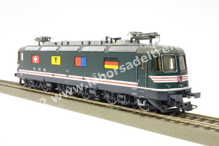 Coppia locomotive elettriche SBB Re 4/4 11323 + Re 6/6 11626, entrambe motorizzate, fanali tondi, livrea verde con decorazioni '100 Anni Ferrovia del Gottardo', epoca IV