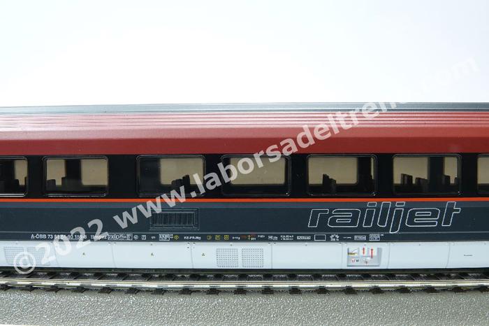 Convoglio "RailJet 059" delle OBB a 8 elementi con locomotiva elettrica OBB E 190 (Rh 1216), una vettura pilota "First/Business", una vettura "Ristorante-First" e cinque vetture "Economy" di cui una con comparto "Family", livrea RailJet, epoca VI - Illuminazione interna con condotta elettrica, Esclusiva per Pirata
